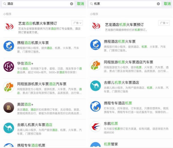 6月16日下午,微信小程序里开始出现广告内容,当通过小程序入口搜索“酒店”和“机票”等关键字时,会看到标注有“广告”字眼的信息。与此同时,在“搜一搜”中搜索这些词条,也会出现同样的广告内容。小程序流量红利到来!