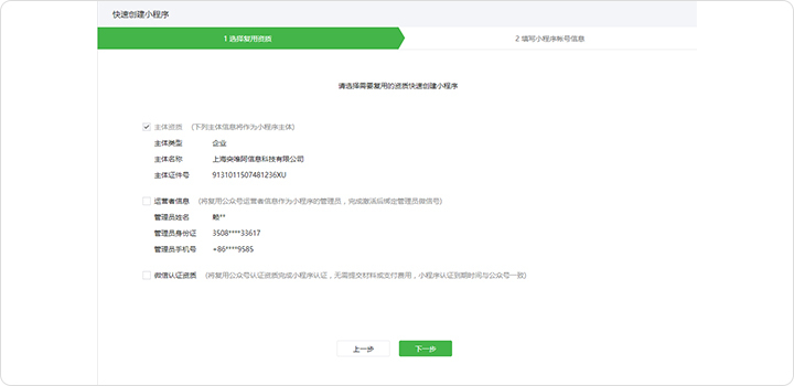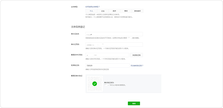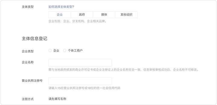 商家根据自己的主体类型,完善主体信息和管理员信息。小程序仅开放给主体类型为公司的商家,暂不开放给个人。企业类型帐号可选择两种主体验证方式。