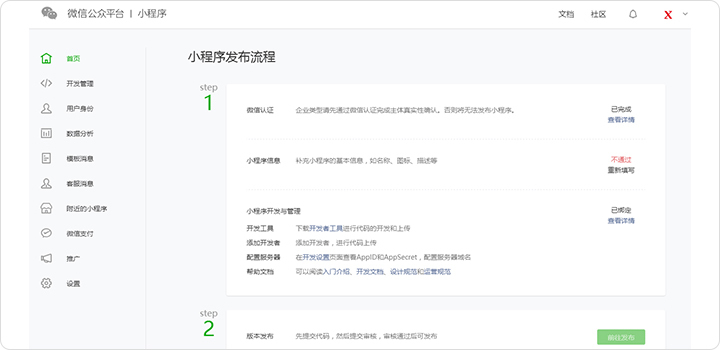 方式二:通过微信认证验证主体身份,需支付300元认证费。认证通过前,小程序部分功能暂无法使用。
