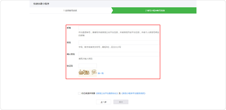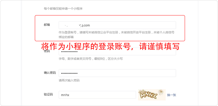 3.按照流程完成注册,以下截图请注意,填写的邮箱将作为小程序的登录使用。完成注册后将无法更改。