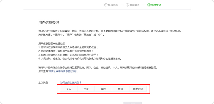 4.在信息登记中我已个人为例进行点击,你们可选择自己都要的类型选择。