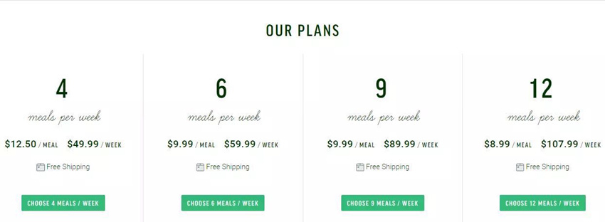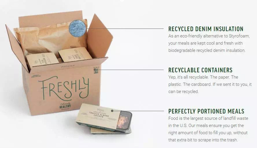 Freshly的销售模式,是以周围单位订餐,可选内容为事物种类和餐数。每周4餐49.99美元,6餐59.99美元,9餐89.99美元,12餐107.99美元。