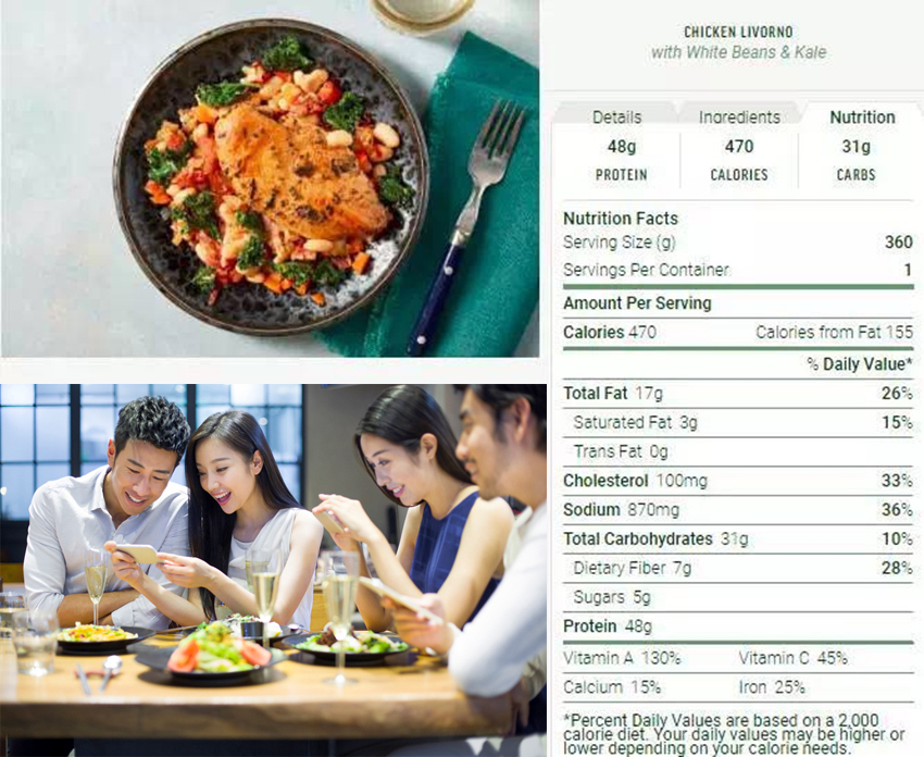 在点餐的时候,点击每道菜品,都会标准对应的配料及营养成分和所含热量,这部分内容也会贴在外包装背后。