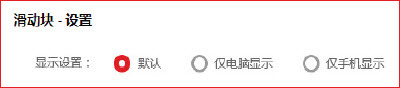 如果您准备让电脑和手机显示不同的滑动块内容,可以使用滑动块显示设置实现这种效果。 在滑动块设置窗口显示设置右侧选择仅电脑显示后,当前滑动块在手机上将不会显示。选择仅手机显示后,当前滑动块在电脑上将不会显示。 请注意:要实现电脑和手机显示不同滑动块效果,您需要在页面上添加两个滑动块,分别在它们的设置窗口中设置仅电脑显示和仅手机显示。