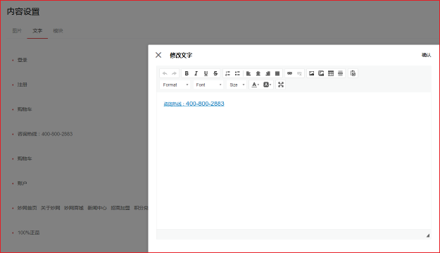 鼠标悬停到页面上方 > 在右侧点击内容设置按钮 > 在内容设置页上点击文字 > 点击要修改的段落或文字 > 在弹出的修改文字窗口中修改文字 > 确认。